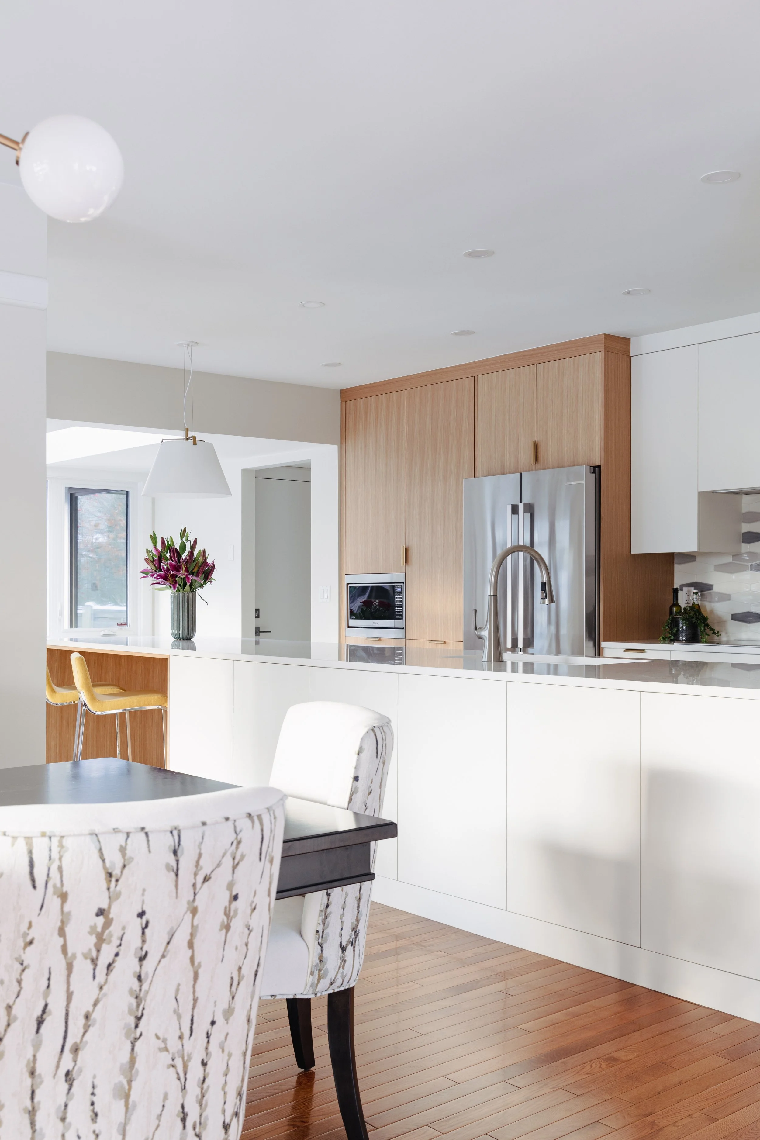 The previous kitchen was a complete closed off galley style. The wall was removed to open up the kitchen completely and let all the light in. Primary pantry storage next the fridge has all food items stored nicely together. A simple paneled hood keeps focus on the geometric tile backsplash. The combination of vertical rift white oak and white cabinetry is clean and modern. Cabinetry with touch latches on the back of the island offer discreate additional storage. The living room cabinetry with rift oak counter tops are a lovely compliment to the kitchen.