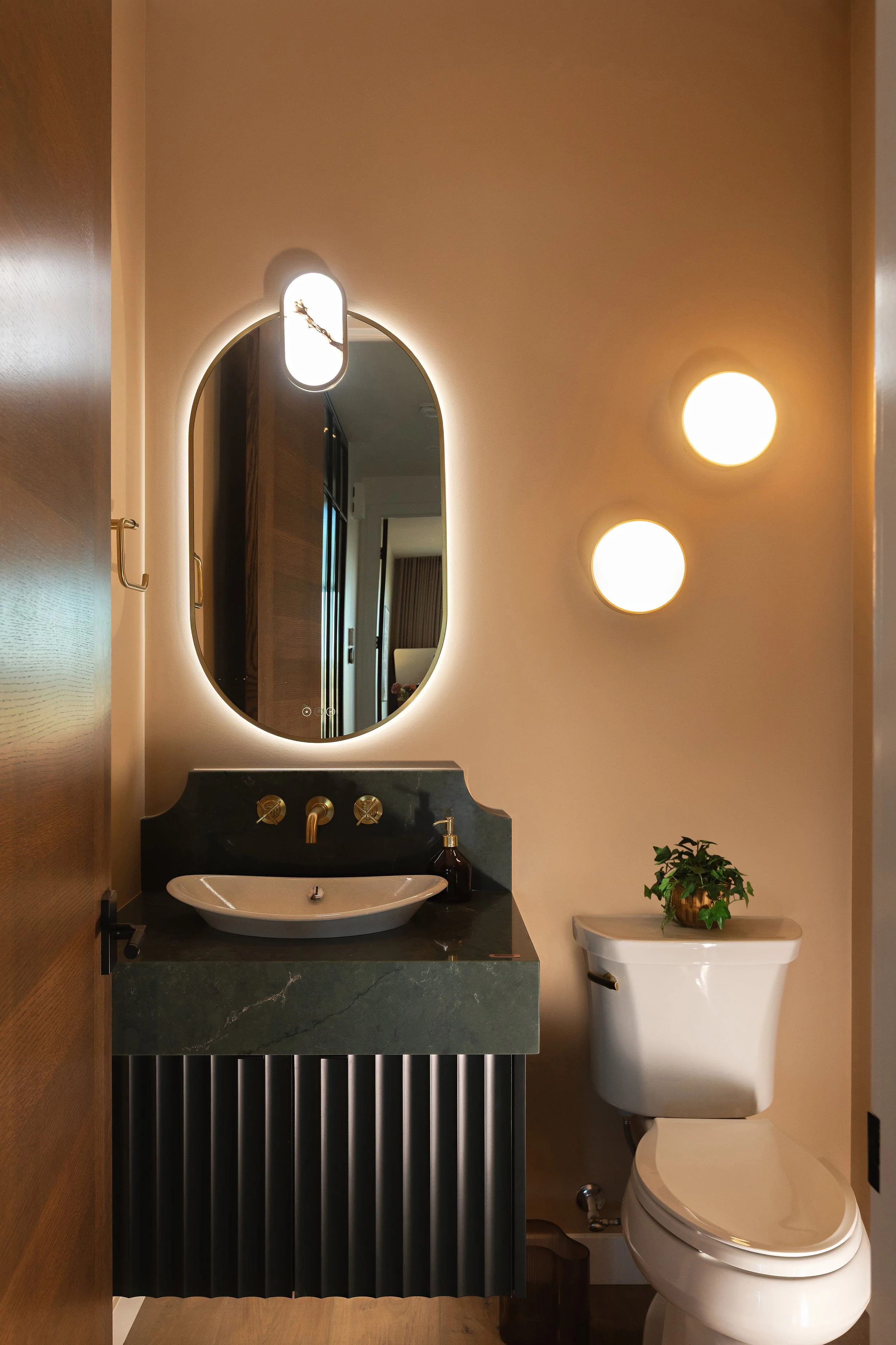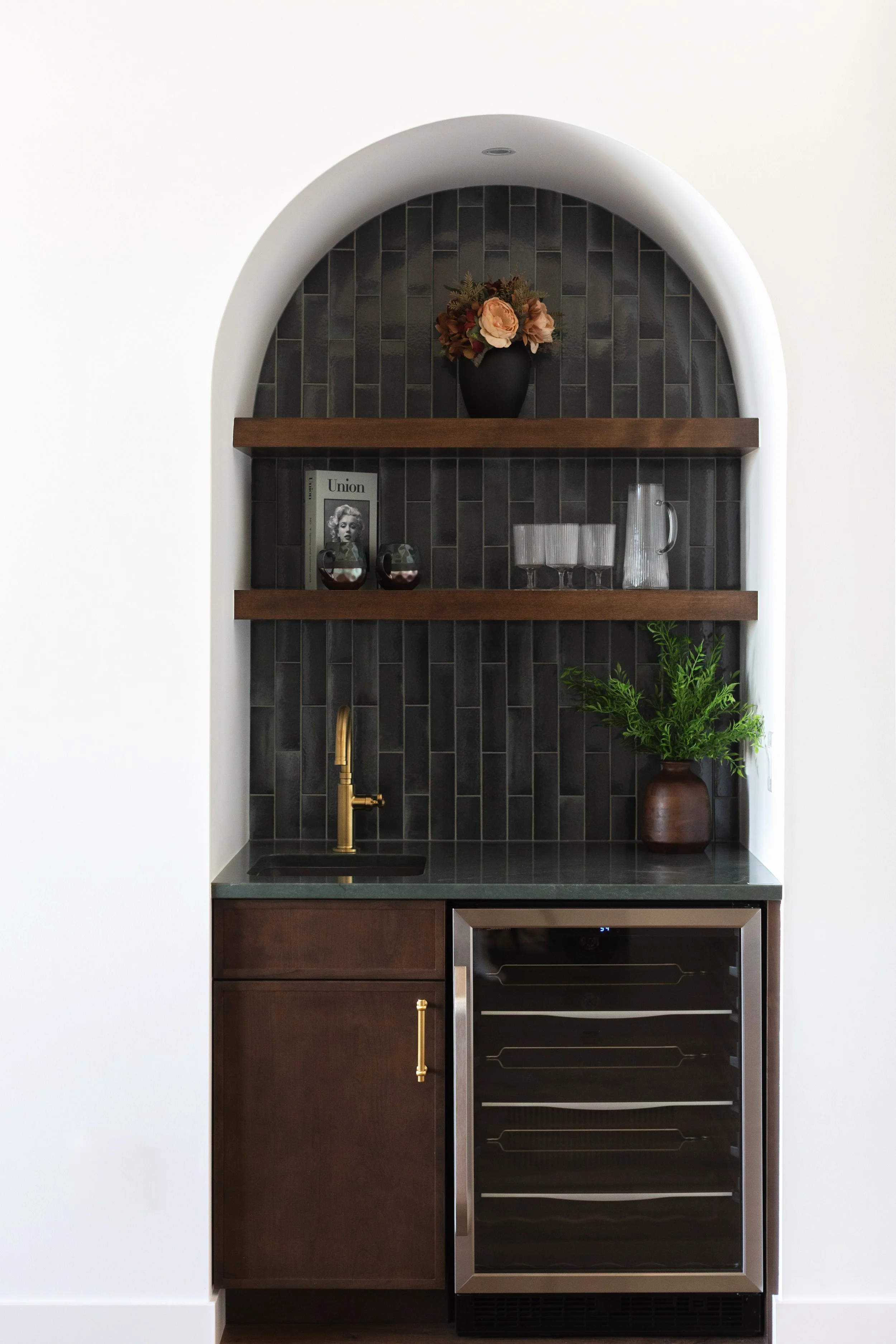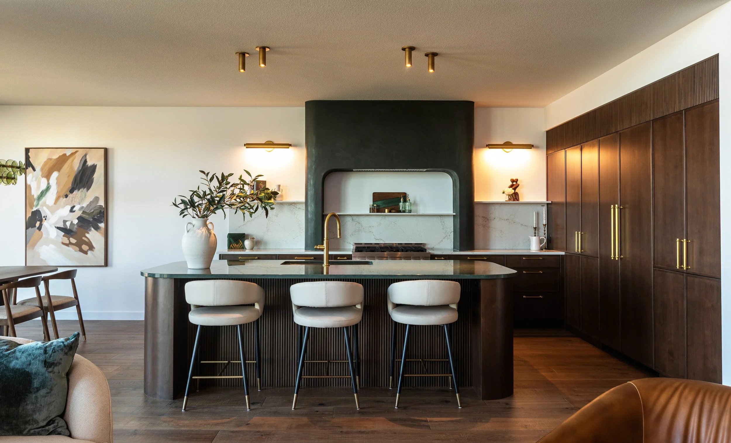To mimic the plastered hood, we curved the island ends. For interest a reeded detail is added along the tall pantry cabinet wall, as well as on the back side of the island. The deep green of the hood is carried into the island countertop colour, as well as the bar’s backsplash tile and the powder room’s bold fluted vanity cabinet.