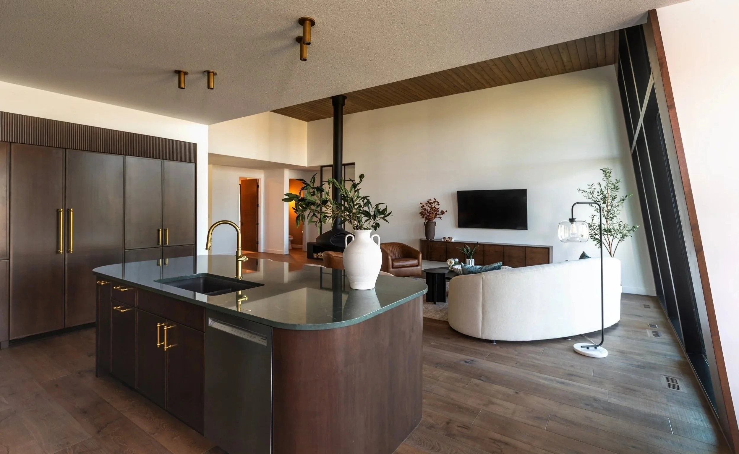 Bold finish selections and integrated curves allow this modern show-home to be a nod to the beloved era of mid-century modern design.