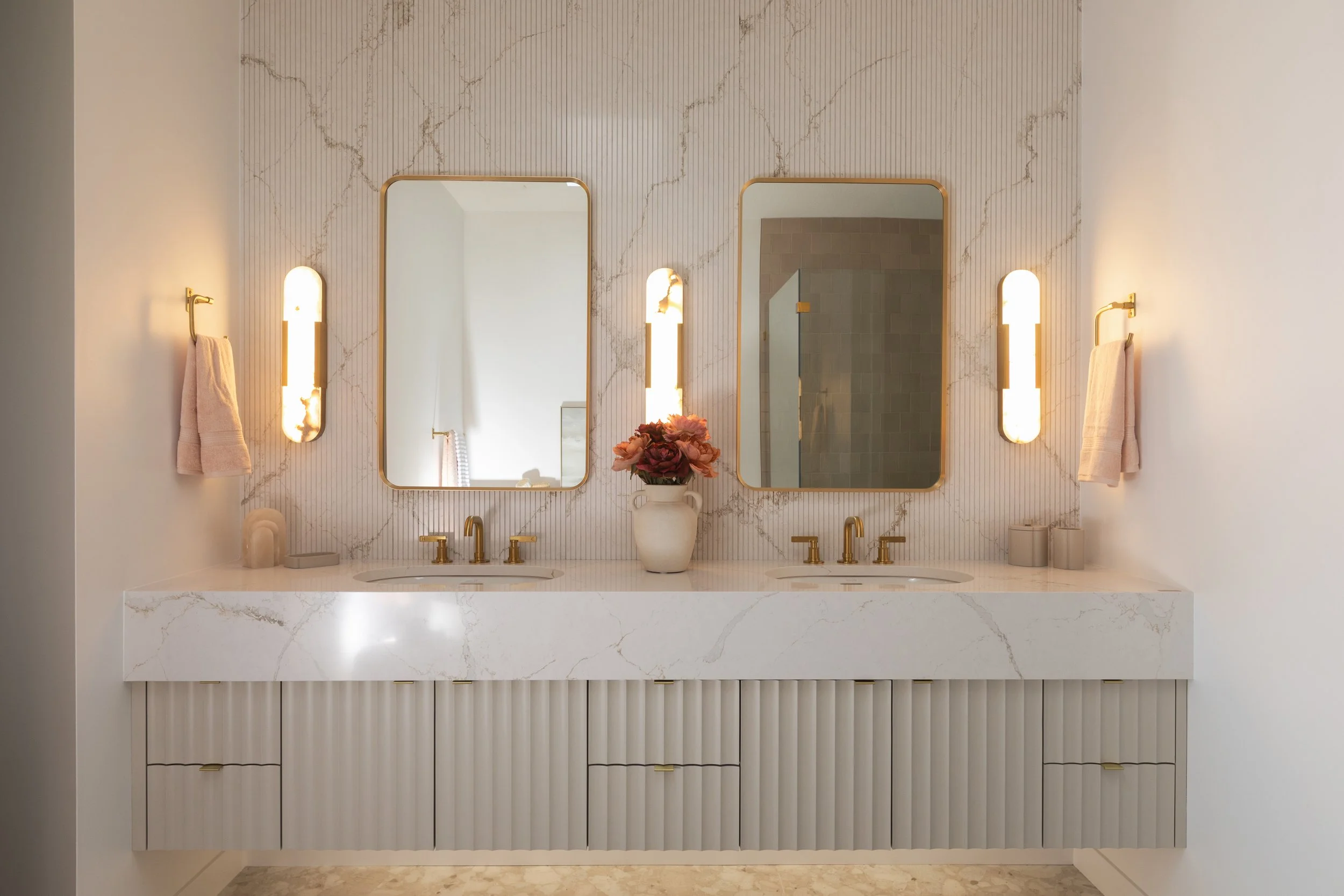 The glam ensuite vanity wall is exquisite in visual texture! Scroll down to see it.